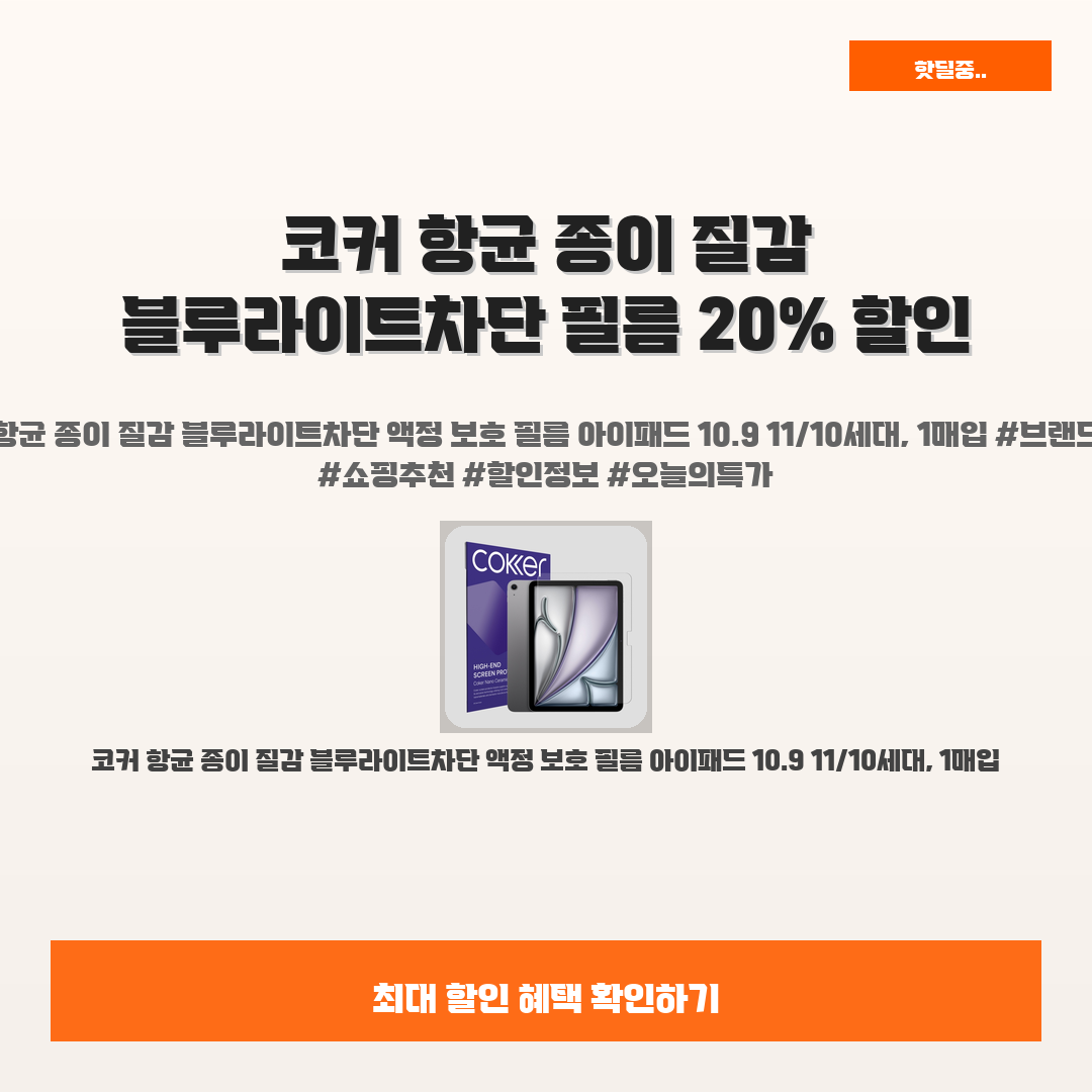 🛍️ 이 포스팅은 네이버 쇼핑 커넥트 활동의 일환으로,판매 발생 시 수수료를 제공받습니다.오늘 소개할 제품은 단언컨데,,그야말로 스마트한 선택! 코커 항균 종이 질감 블루라이트차단 액정 보호 필름 아이패드 10.9 11/10세대, 1매입이랍니다.혹시 아이패드 화면에 끼든 눈부심이나 블루라이트 피해가 걱정되신 적 있나요? 이제 그 고민은 그만!코커 필름은 20% 할인 중이에요! 단 17,800원에 만나볼 수 있답니다.사용해보면 바로 느끼실 거예요. 눈이 편안해지고, 화면 보호도 완벽하니까요! 이제는 망설이지 말고 스마트한 선택을 하세요!여러분의 아이패드를 더욱 안전하게 지켜줄 코커 필름, 기회를 놓치지 마세요! 믿고 사용하는 제품입니다. 지금 바로 확인해보세요!※ 이거 진짜 제가 직접 써보고 쓰는 리뷰예..